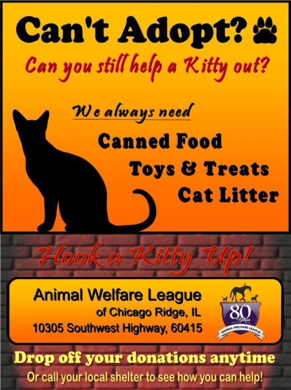 Monday closed thank you. In the chicagoland area we help all animals through our adoption programs our low cost clinic services our local cruelty investigations and our public education programs. In may 1992 animal welfare league moved into a state of the art full service shelter at 10305 southwest highway in chicago ridge where we can accommodate the increase in the number of homeless and unwanted animals housing the largest number of adoptable animals from a non profit organization in the entire mid west. This simply means that one of our investigators goes to your home and checks for yard space fencing etc.
